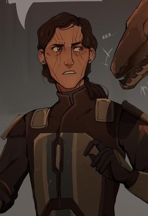 Not having a choice in the matter- the colonists are their only source of survival- Mordred does their best to sabotage the building of said weapon, while stealing food to give to the creatures, preventing further attacks on the base. They begin to spend more long hours building trust with them- in particular, a young female raptor whom Mordred affectionately nicknames Burc'ya, the Mando'a word for 'friend', or Boo for short.Frustrated with the colonists' refusal to listen to them, Mordred gets into what almost ends up being a physical fight with the commander of the base. Through this, Mordred's attempts to sabotage the weapon are revealed. It is decided that it can't wait any longer; the weapons will be deployed, and Mordred will be sentenced to imprisonment.How long they languish in imprisonment for, Mordred isn't sure. Weeks, months maybe, tormented by the guilt they feel for their part in wiping out the dinosaurs. When they start hearing what sounds like a raptor scurrying around near their cell, they're sure they've gone insane- even more so when Boo's face appears on the other side of the bars. It takes a lot of convincing on Boo's part before Mordred realises that she is, in fact, real and alive, though the last survivor of her species. What follows is a prison escape that they barely escape by the skin of their teeth. Mordred is able to steal a ship for them and Boo, leaving the planet behind for good.In order to survive and make a living for themselves, Mordred puts their combat skills to use as a bounty hunter, an occupation that takes them traveling across the galaxy.